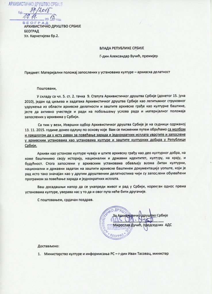 Извршни одбор Архивистичког друштва Србије, са састанка одржаног 13. новембра 2015. године, упутио је Александру Вучићу, премијеру Владе Републике Србије, као и Министарству културе и информисања Републике Србије - министру Ивану Тасовцу, акт у коме је скренута пажња на материјални положај запослених у архивској струци и култури уопште.