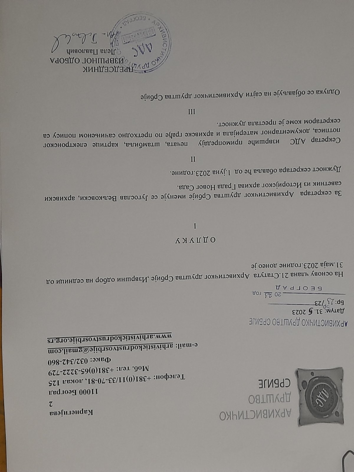 Након извршене примопредаје дужности између секретара, 6. јуна 2023. године, са колегама из Државног архива Србије договорен је термин стручног надзора за 12. јун 2023. године.